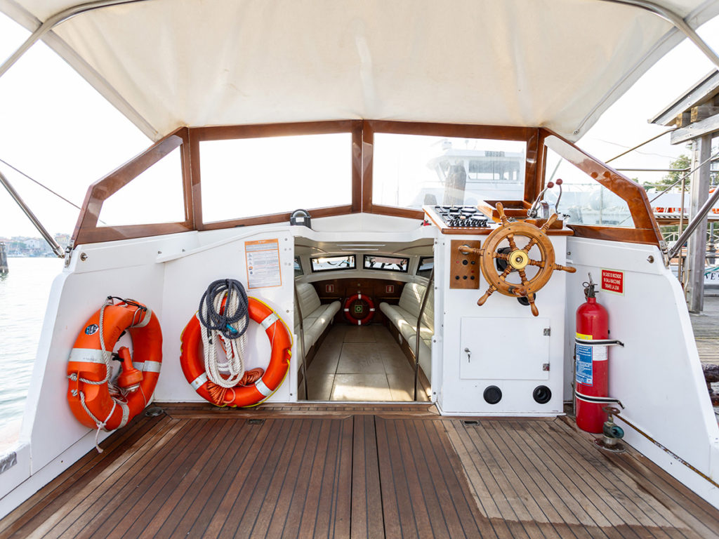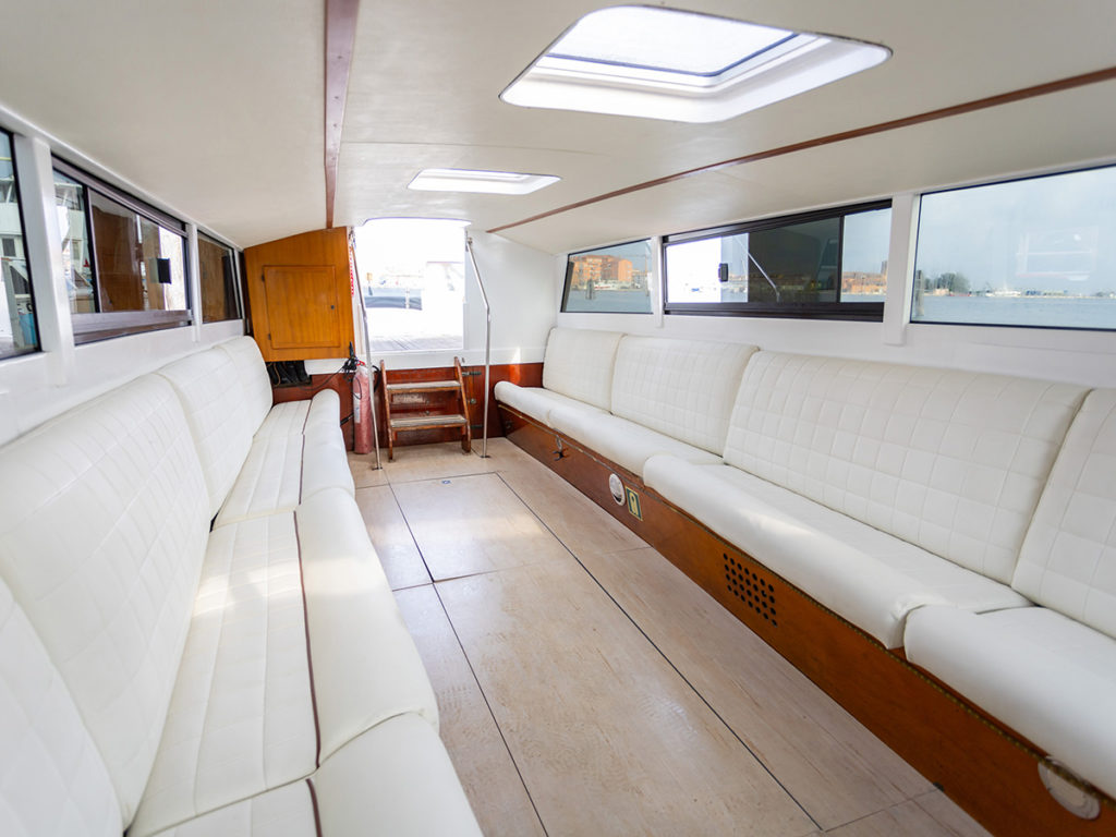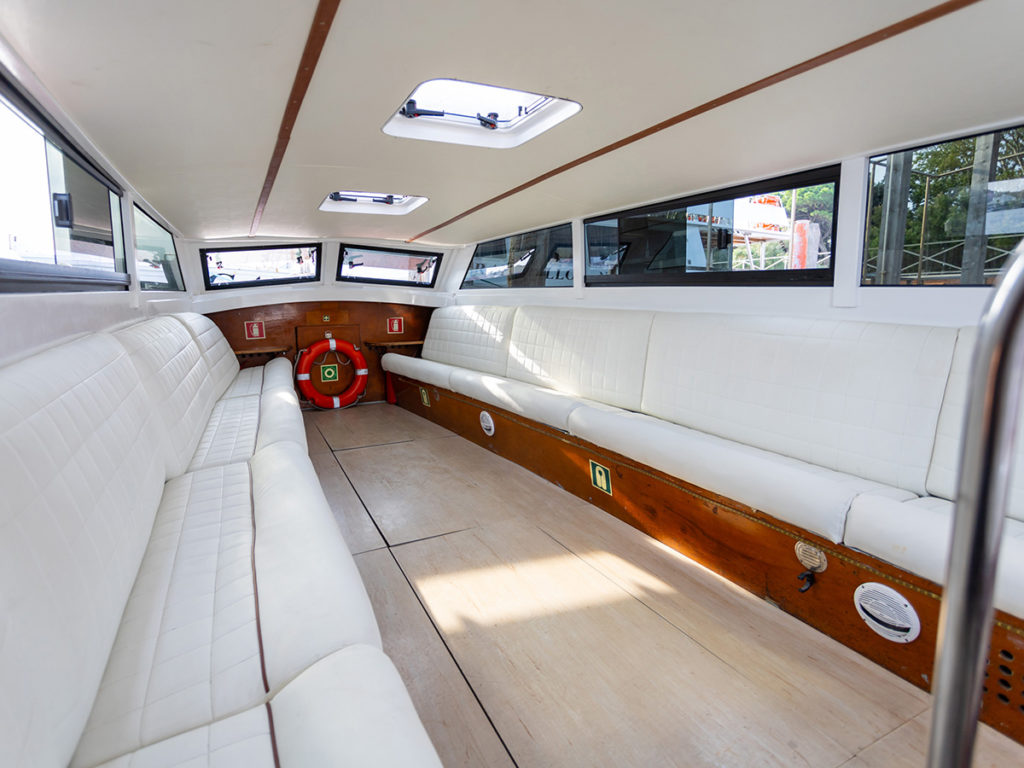 É dotato di una cabina coperta a prua con 30 posti a sedere al coperto su comodi divani e di un pozzetto scoperto con 12 posti a sedere su comodi cuscini.